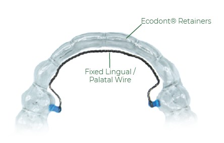 Crafted from 1.0 mm-thick, triple-layered, BPA-free material, Ecodont® Retainers are supplied in sets of one or three, complete with a retainer case and a three-month warranty. These retainers combine clarity, strength, and comfort, helping patients preserve their results confidently. For added convenience, the Ecodont® Combi Retainers merge a clear removable retainer with a fixed lingual or palatal wire, all fabricated from a single scan. This innovative hybrid design reduces chair time, simplifies retention protocols, and ensures reliable, long-term stability.